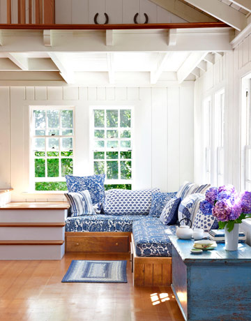 Look how the sun streams in... ooh I would so enjoy curling up in that spot.... oh yes there's even a pot of tea there. Love the ceiling too and the windows. I'd have to change the pine sofa base to white wainscot though.... just have to.