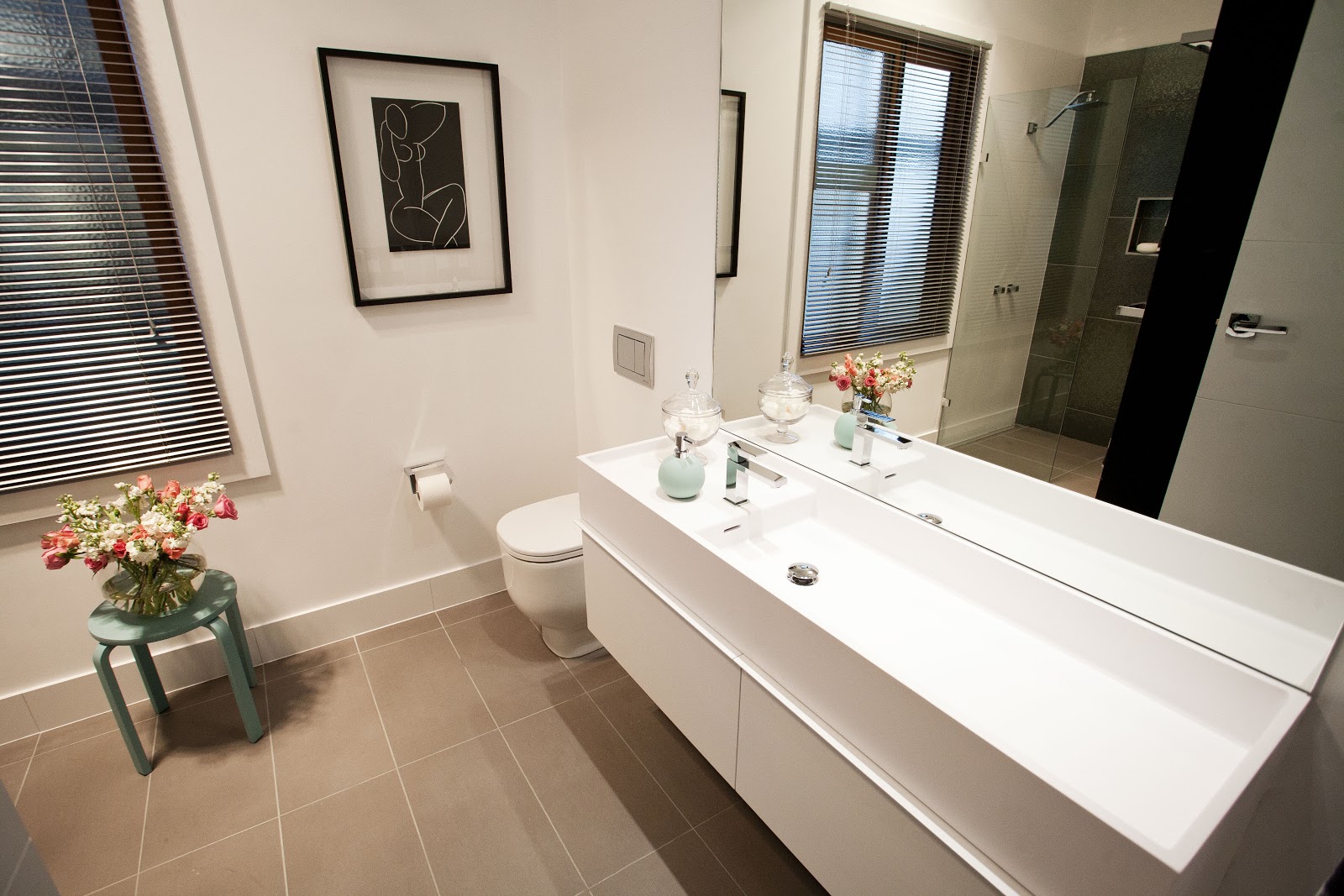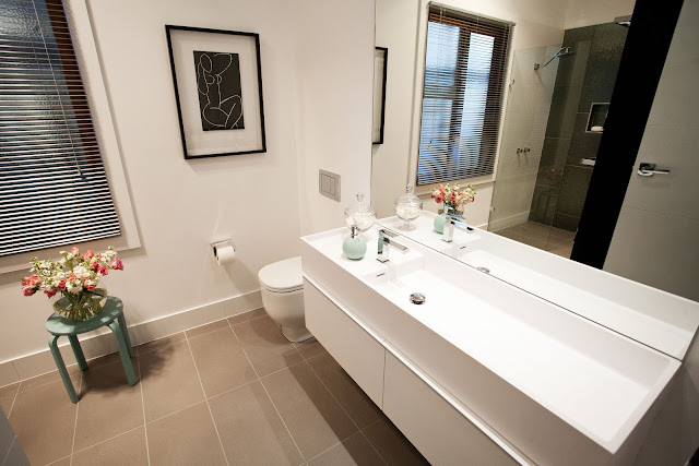 But yay, they rose from the ashes and produced this beauty... with a gorgeous basin, stunning tiles... and a real sense of space. Remember who their target market is.. DINKS..and remember this doubles as a downstairs powder-room too. No need for a bath. There was a bit of stress around not being able to fit a bath in. Girls, the bath was not an issue at judging was it! Yay!