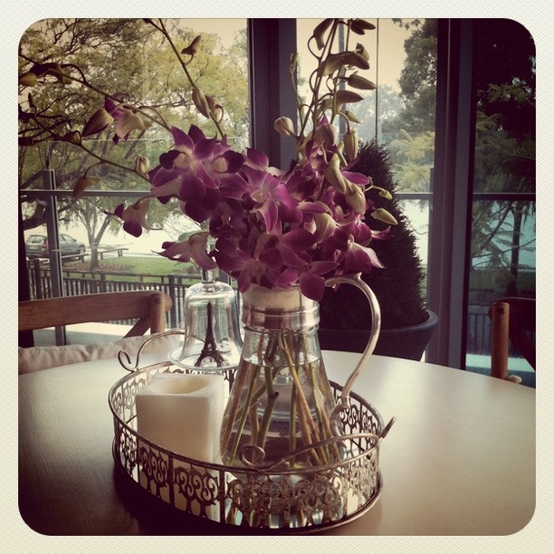 How about we start off the week with some pretty flowers? These beautiful orchids were given to me by my friend A-Mi (Anne-Marie with a i)..... yes shoved in a water jug... my kingdom for a vase. That photo was taken on our rainy Saturday... boy did it rain... from my little kitchen table.